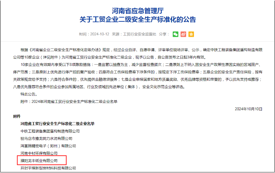 此次獲得省安全生產(chǎn)標(biāo)準(zhǔn)化二級企業(yè)稱號,既是對公司安全生產(chǎn)工作的認(rèn)可,也是對公司未來安全發(fā)展、科學(xué)發(fā)展、可持續(xù)發(fā)展的鞭策。今后,公司將繼續(xù)牢固安全生產(chǎn)紅線,有效運行安全生產(chǎn)標(biāo)準(zhǔn)化體系,持續(xù)改進(jìn),不斷提高公司本質(zhì)安全水平,為集團(tuán)高質(zhì)量發(fā)展貢獻(xiàn)龍豐力量。