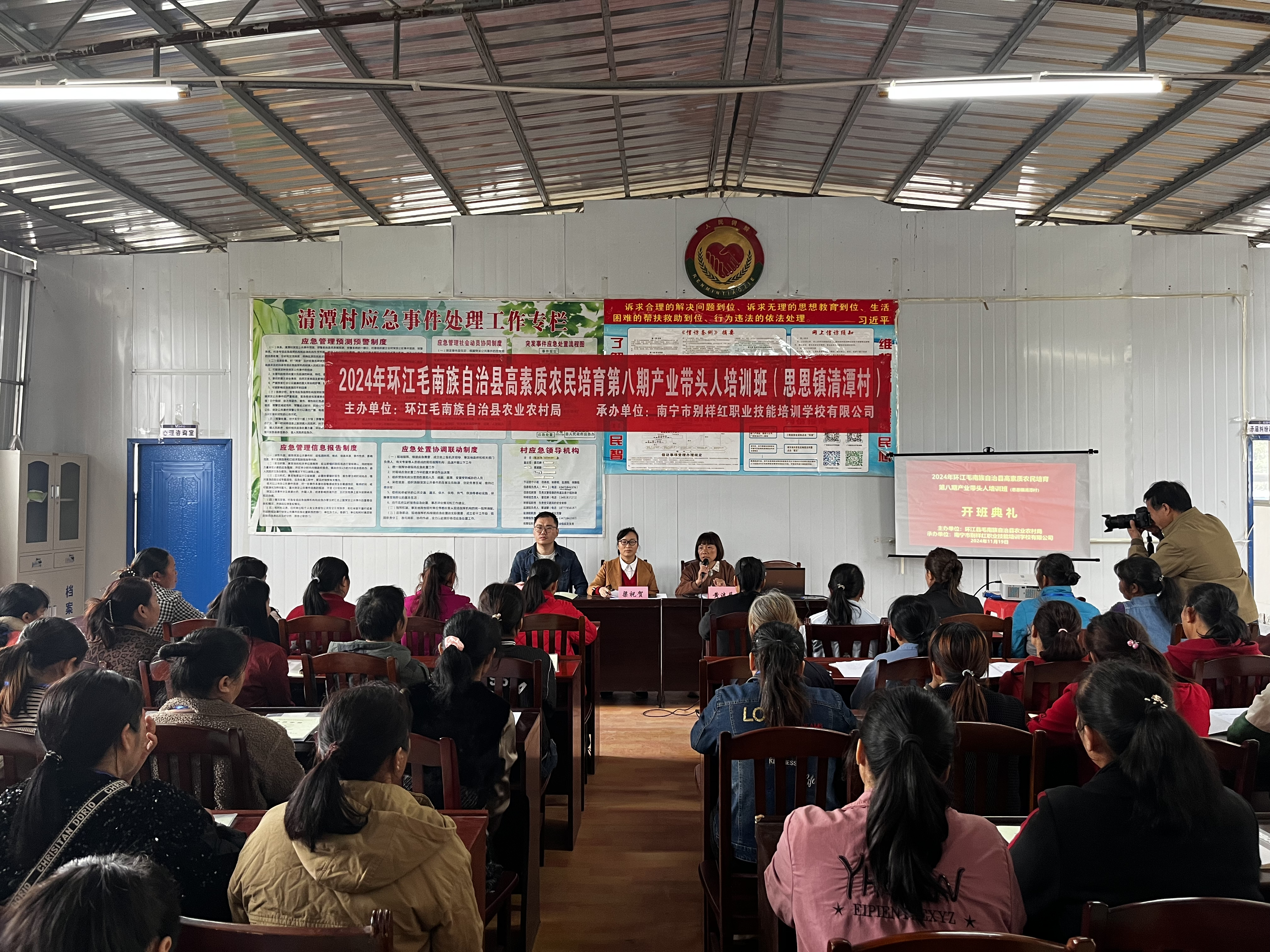 11月19日,由環(huán)江毛南族自治縣農(nóng)業(yè)農(nóng)村局主辦,南寧市別樣紅職業(yè)技能培訓(xùn)學(xué)校有限公司承辦的《2024年環(huán)江毛南族自治縣高素質(zhì)農(nóng)民培育第八期產(chǎn)業(yè)帶頭人培訓(xùn)班》在思恩鎮(zhèn)清潭村順利開(kāi)班,環(huán)江毛南族自治縣農(nóng)業(yè)農(nóng)村局副局長(zhǎng)覃江湖、農(nóng)業(yè)科教站站長(zhǎng)黃潔薇、清潭村第一書記梁祝賀出席開(kāi)班典禮,40余名鄉(xiāng)村社會(huì)服務(wù)組織帶頭人、農(nóng)業(yè)技術(shù)人員、鄉(xiāng)村致富帶頭人以及返鄉(xiāng)農(nóng)民工等高素質(zhì)農(nóng)民參加培訓(xùn)。